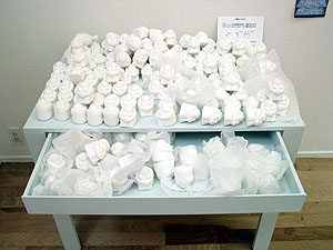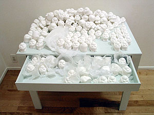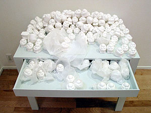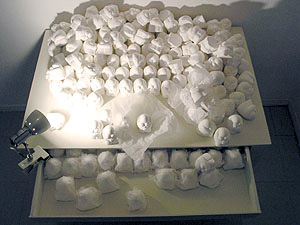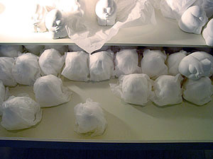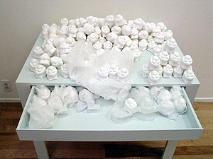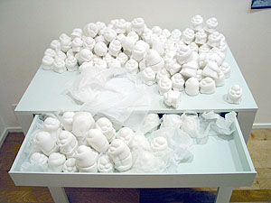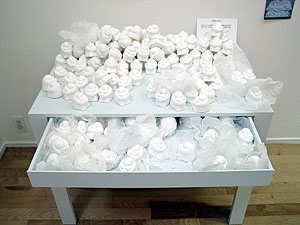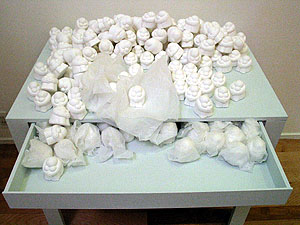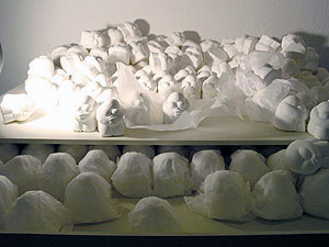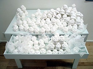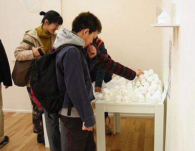 The work is re-designed. Visitors can chage the structure of the work. "There are figure that expressed an emotion here and then there are two main actions. For one thing it is dispose of it one more is open it up. Then, please move it so you may think." |