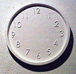 The work contains three elements, figure the expressed an emotion, a clock without hands and oparations on a desk.