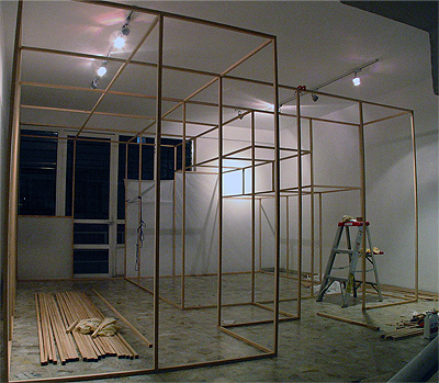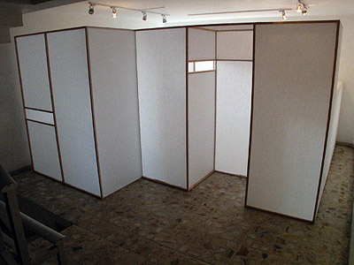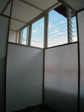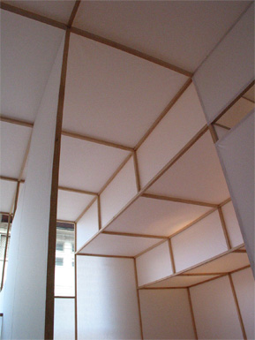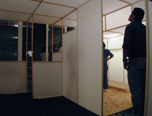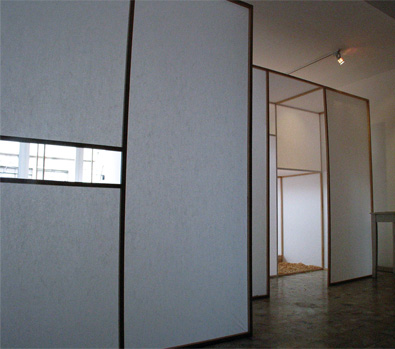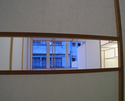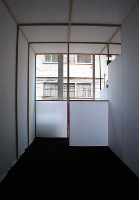 | Thin white paper walls limit people's field of vision. Three different scenes are cut off from each other but all have a view outside through the same single window. The viewer walks through the work and sees them one by one. At the end they can get out from the window to a balcony and view all the scenes from outside, as a whole. The difference between knowing the whole place or just the separate scenes within the work asks people to reconsider the relationship with the space. |