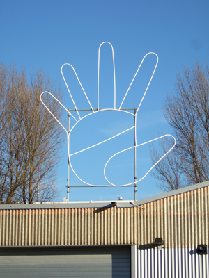 A drawing-like hand shape has been placed on the top of a building. The building stands between two rows of poplar trees. There is a gap in each row, directly opposite each other, at the centre point of the building, and the wind blows through this gap, over the building. The hand, placed as if to block the wind, however the hand only has outlines. It stands in the wind, but it will never catch it. |