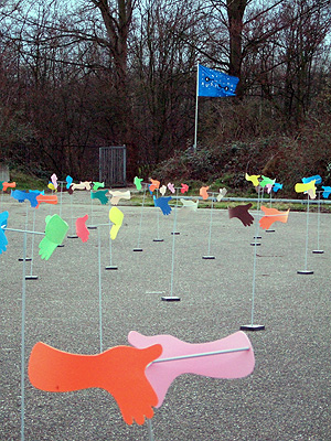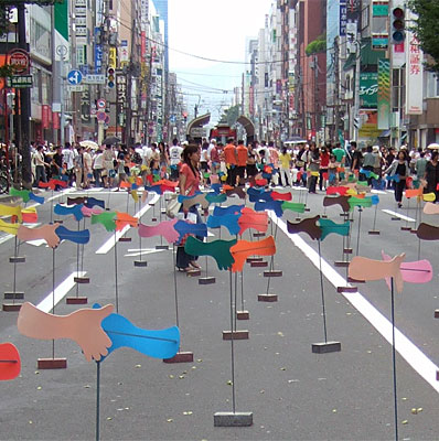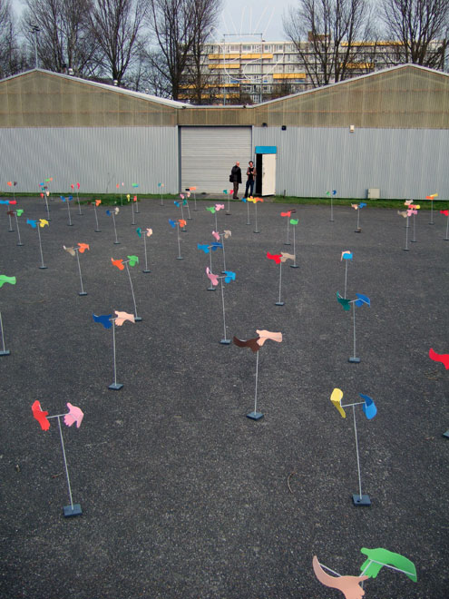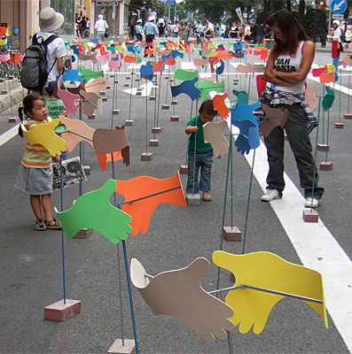 | Pairs of hands, differently coloured but the same shape - as in the world, rotate when the wind blows as if to try to shake each other. Although this will never happen, it is not necessarily a pessimistic view, but rather observed without judgement in society. It has both a positive and negative side. The situation can be interpreted as the process or the result. | ![]() |
